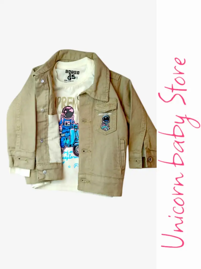 توينز جاكت مكون من 2 قطعه شميز بيج خامه من الجينز + تيشيرت كم خامه من القطن مطبوع رسمه رائد فضاء