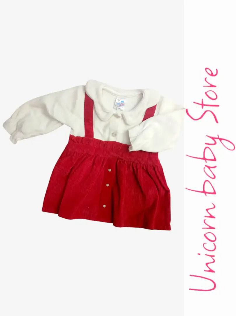 تنورة باللون الأحمر الزاهي بحمالات عملية تضيف لمسة كلاسيكية.