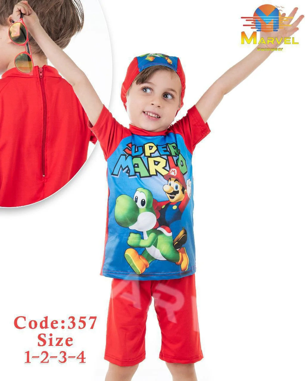 - مايوه سوبر ماريو كلاسيكي: يتميز هذا المايوه بتصميم ماريو التقليدي مع قبعة حمراء وقميص أزرق.